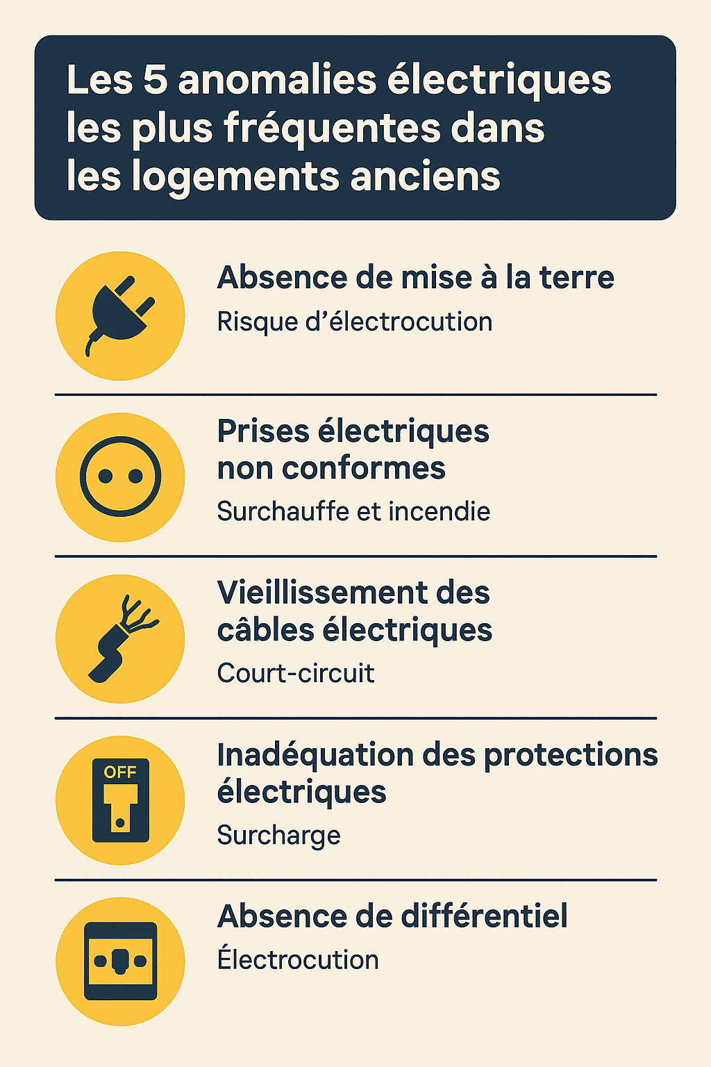 Les prises électriques non conformes sont une autre anomalie fréquente dans les logements anciens. Ces installations vétustes ne répondent souvent plus aux normes actuelles, ce qui peut engendrer divers risques.